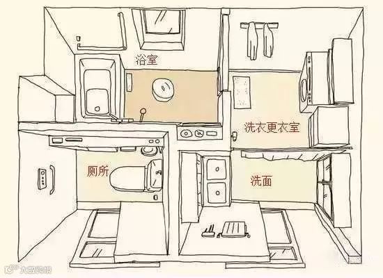 当然,有些家庭还把洗衣间也容纳进来,这样一来,“三式分离”就变成了“四式分离”。在同一个空间内,洗浴、洗脸台、洗衣间与马桶融为一体,互不影响。