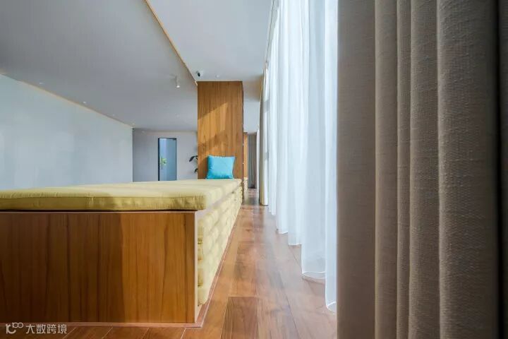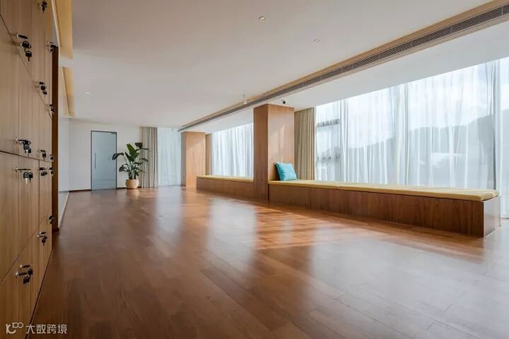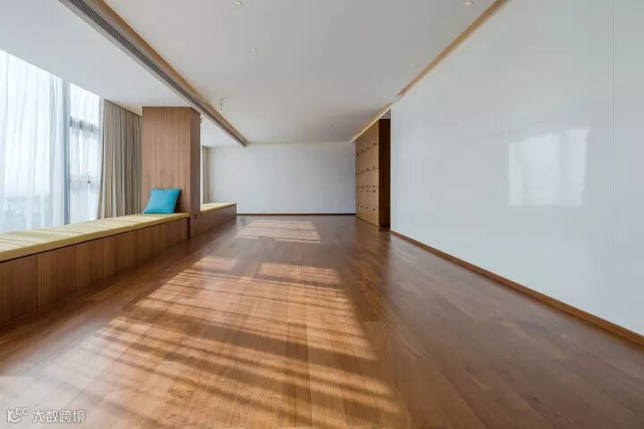 三层室内作为小朋友活动教学,以及住宿的主要区域,空间简洁明亮,偌大的落地窗,阳光透过纯白的纱帘洒在木地板上,一群孩子正在认真的听教练讲课