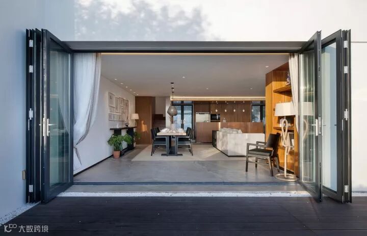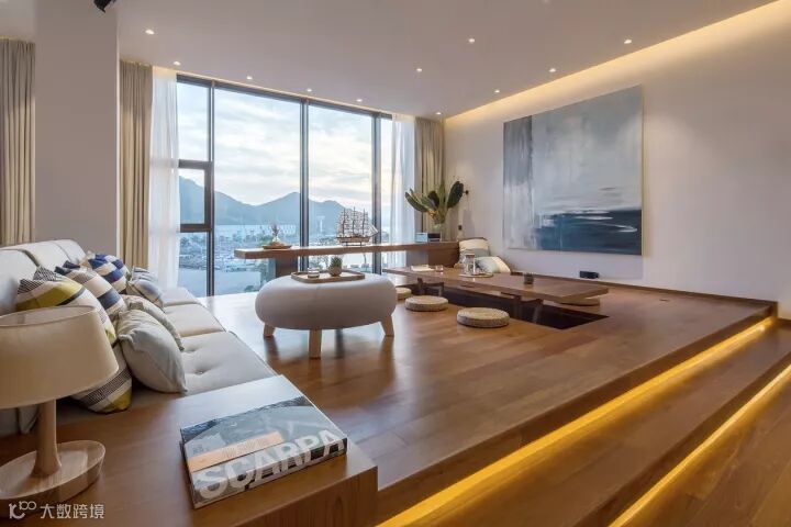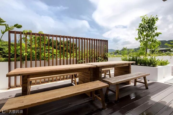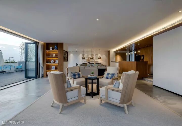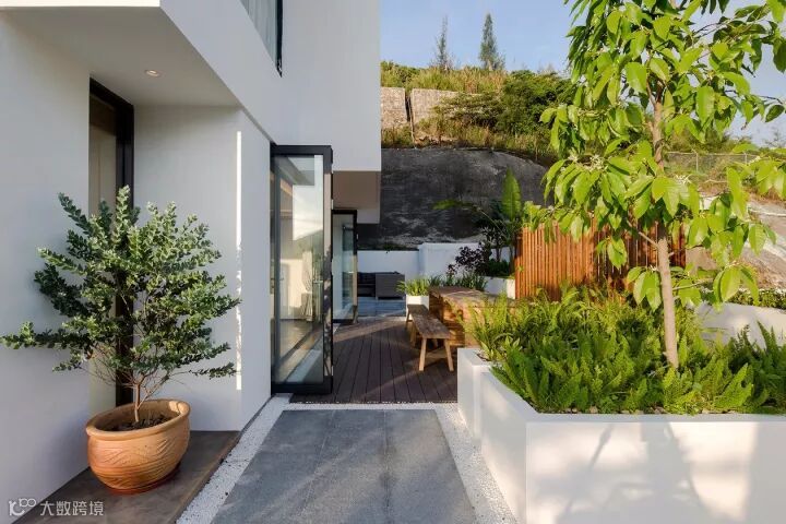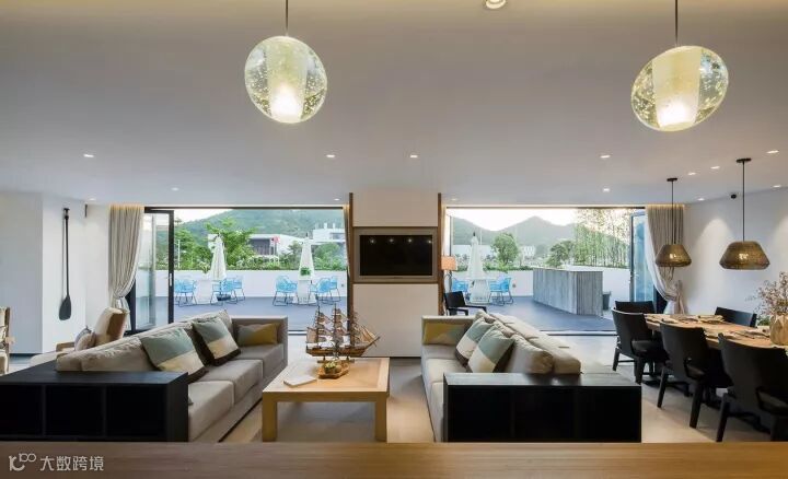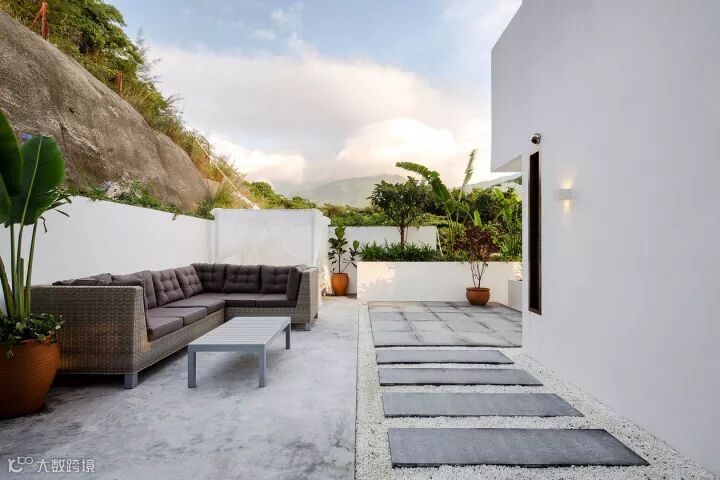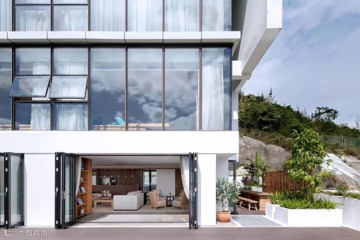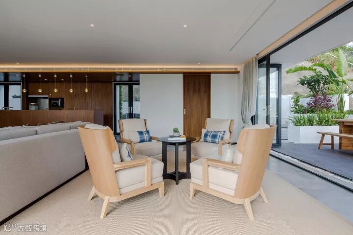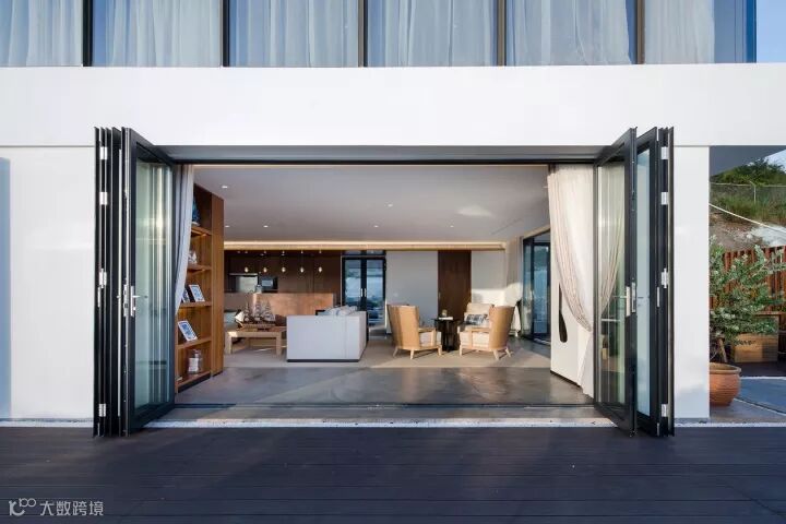 临海的露台,是室内空间的延续,可移动式轻巧座椅的设置,满足各式活动对露台的多变易用性要求。同时,不打搅室内视线所及的框景独享:如画的山、风动的云、听闻的海。
