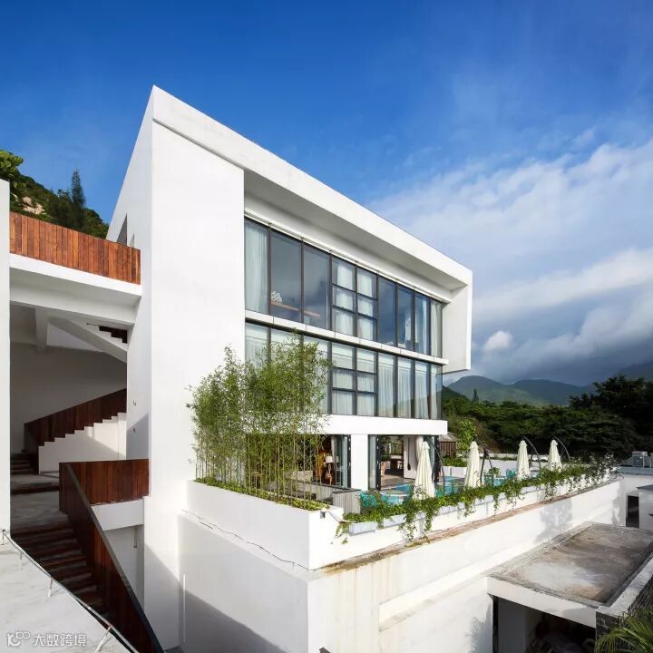 设计师保留了原先白色的极简建筑,将其中加入适合海边生长的绿植和花草,以及在建筑的某些结构上使用感觉亲近的木质材料,让原本单调而冰冷的建筑空间多了些自然的肤色,在体现极为纯粹现代主义风格的同时让整个建筑成为充满活力的象征。