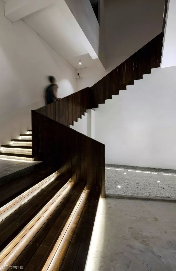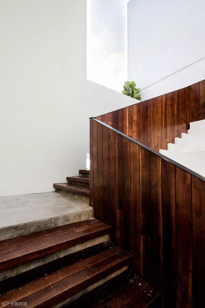 拾阶而上,视线豁然开朗。以木本色搭配建筑原本的纯白外墙,使墙体可随一日的阳光变化,穿戴一层随性的自然光影外衣。