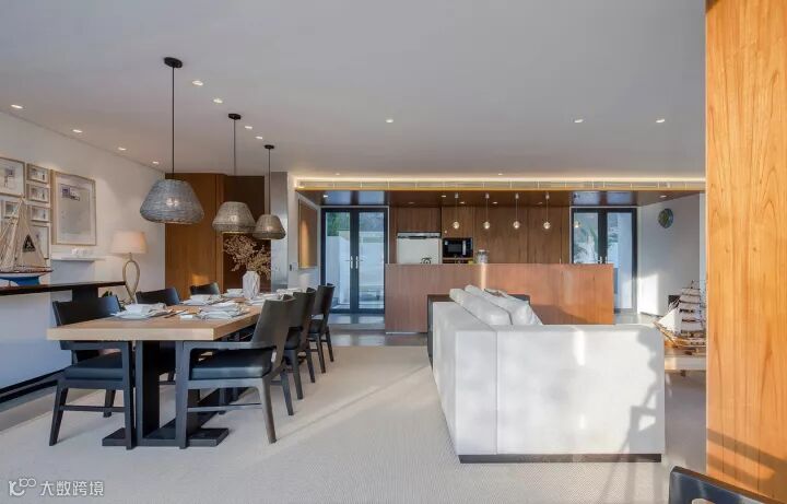 二层室内作为主要的活动场所,在很好满足功能需求的前提下,黑白灰的空间,搭配现代舒适的家具,利用通透而开放的建筑结构,引景入室,为整个空间融入自然元素,营造温暖清新的气息。