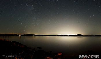瑞典湖面上反射出大城市上空的光晕,请注意地平线上的穹顶形状。天空发光通常都是属于间接光。从远处看,它像一个光穹顶。当光进入空气中的粒子(如水蒸气、烟雾或其他污染物)中时,就会出现这种穹顶。怀特解释说,这些分子会散射光,产生可见光。