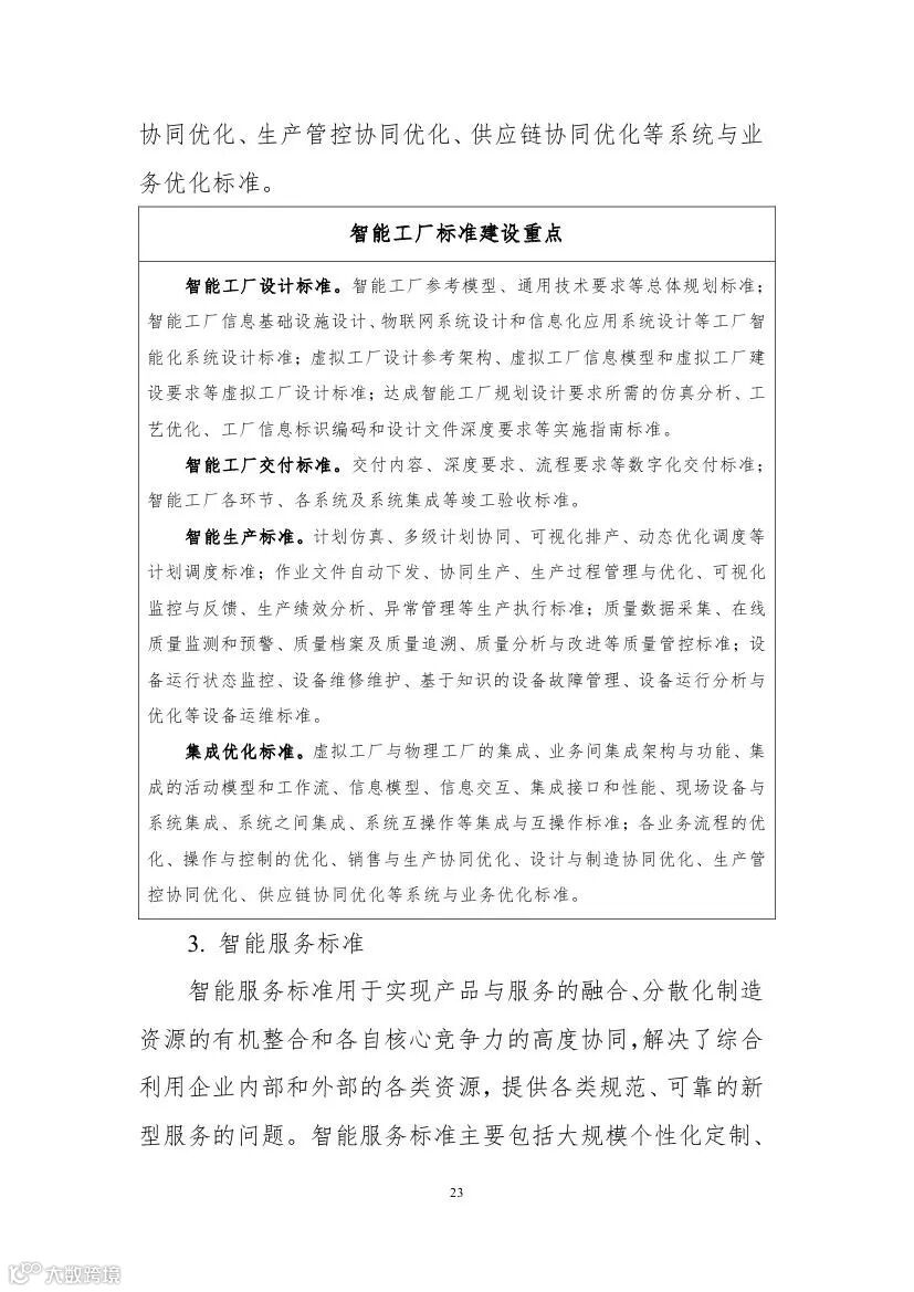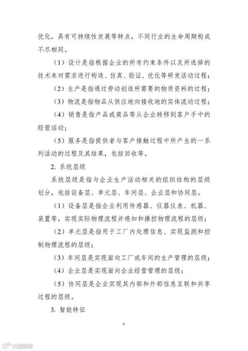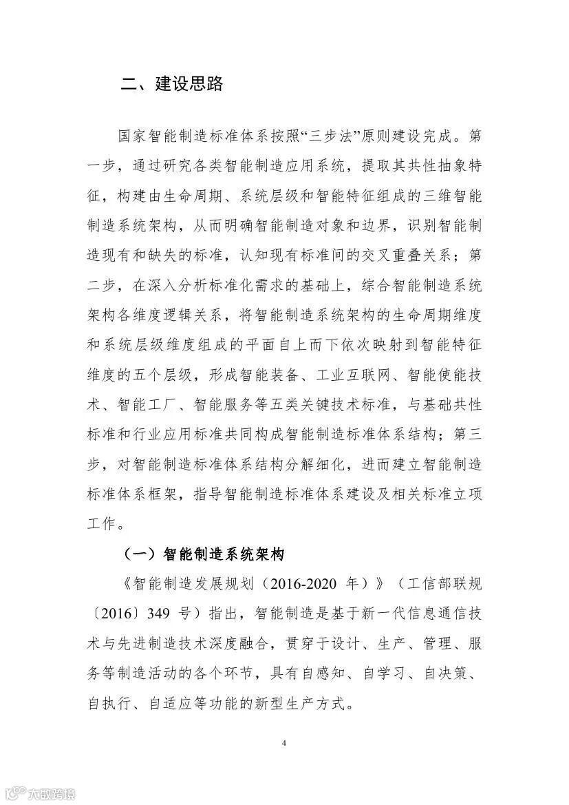 征求意见稿提出,国家智能制造标准体系按照“三步法”原则建设完成。第一步,通过研究各类智能制造应用系统,提取其共性抽象特征,构建由生命周期、系统层级和智能特征组成的三维智能制造系统架构,从而明确智能制造对象和边界,识别智能制造现有和缺失的标准,认知现有标准间的交叉重叠关系;第二步,在深入分析标准化需求的基础上,综合智能制造系统架构各维度逻辑关系,将智能制造系统架构的生命周期维度和系统层级维度组成的平面自上而下依次映射到智能特征维度的五个层级,形成智能装备、工业互联网、智能使能技术、智能工厂、智能服务等五类关键技术标准,与基础共性标准和行业应用标准共同构成智能制造标准体系结构;第三步,对智能制造标准体系结构分解细化,进而建立智能制造标准体系框架,指导智能制造标准体系建设及相关标准立项工作。