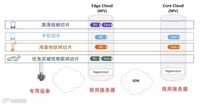 手机切片:原网络无线接入部分的数字单元(DU)被虚拟化后,放入边缘云。而原网络的核心网功能,包括IMS,被虚拟化后放入核心云。