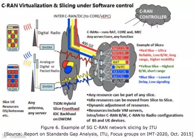 现在,我们来到前传部分。如何完成5G 射频单元(RU)与边缘云之间(前传)部分的切片?首先需要定义5G前传的标准,目前并没有统一的标准。下图是国际电信联盟(ITU)5G移动通信标准研究小组(Focus Group on IMT-2020)曾提出的一个虚拟化前传的结构图,有兴趣可以看看: