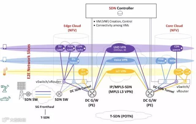 5G切片网络通过SDN连接边缘云和核心云里的VMs。核心云里有虚拟化的服务器,服务器的Hypervisor里运行着内置的vRouter/vSwitch,SDN控制器负责在虚拟服务器与DC G/W路由器之间创建SDN tunnels,随后,SDN控制器执行SDN tunnels和MPLS L3 VPN之间的映射,从而建立核心云与边缘云之间的连接。