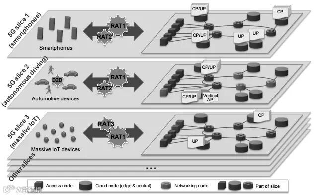 这样,网络采用NFV和SDN后,执行切片就非常容易了,像切面包一样水平将网络“切”成多个虚拟子网络(片)就可以了。
