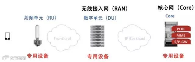 目前4G网络中主要终端设备是手机,网络中的无线接入网部分(包括数字单元(DU)和射频单元(RU))和核心网部分都采用设备商提供的专用设备。