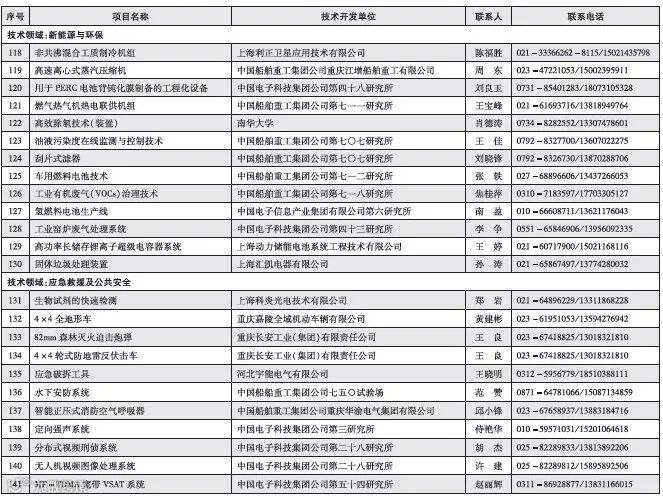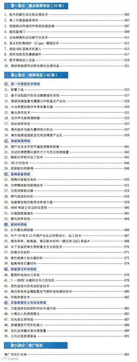 根据通知指示,目录公布了150个项目,十大重点推荐项目,包含航天热解生活垃圾处理技术、第二代高温超导带材、智能移动终端用声表面波滤波器、超低温阀门、全地域高机动运载平台技术、复合材料微细杆(Z-pin)增强技术、测绘600型海洋机器人、柔性电致变色薄膜器件、数字维纳加工设备、微波智能病死动物无害化处理设备。围绕新一代信息技术、智能制造、高端装备、新材料、新能源与环保、应急球员及公共安全共计六大领域,公布了40项推荐项目。