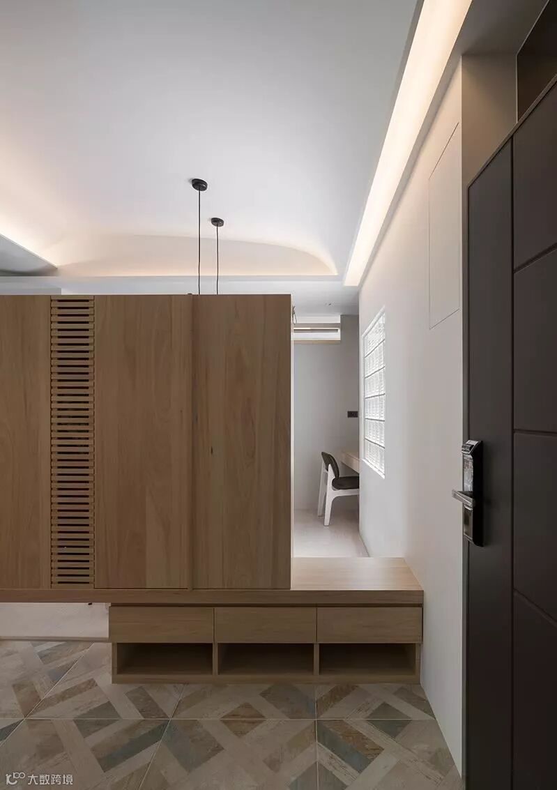 玄关区,选用复古砖铺陈地面,并规划一道Z字体透空柜体,结合衣柜、鞋柜、穿鞋椅等功能,不只落实多元机能,也保有入口视线的延伸性。