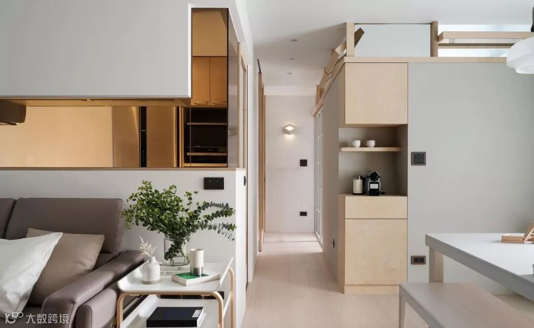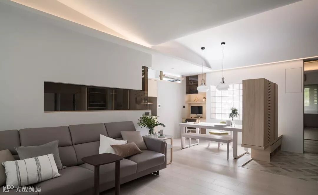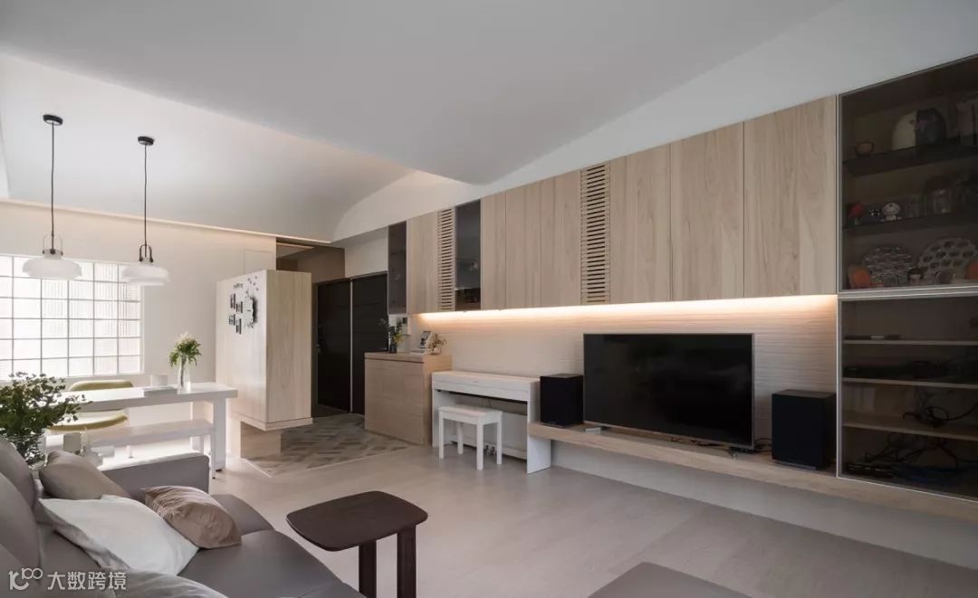 位于客厅后方的厨房,于隔间穿插茶玻材质,形成场域之间的视觉流动,电视墙则连接了完整的收纳与展示柜,创造一整道强大的机能。