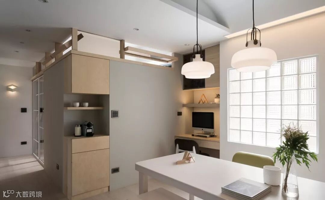 餐厅区域,以玻璃砖窗户导引采光,将电脑桌安排在一旁,让此区适用工作、阅读与用餐等主题。