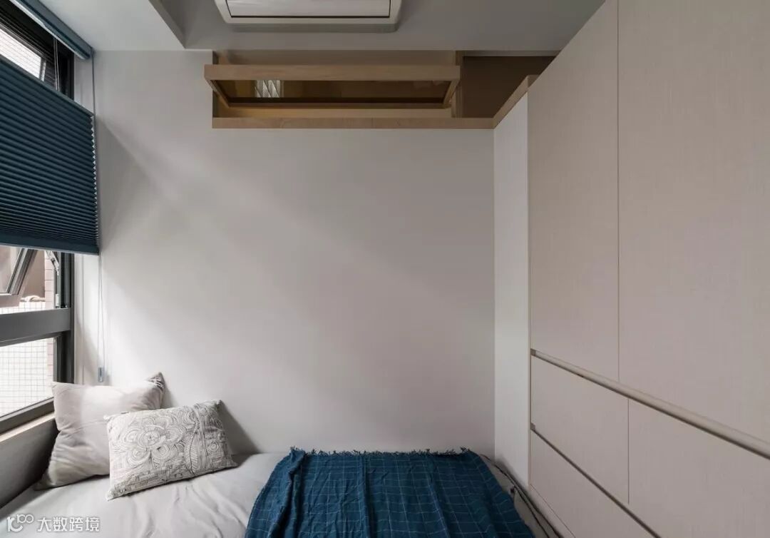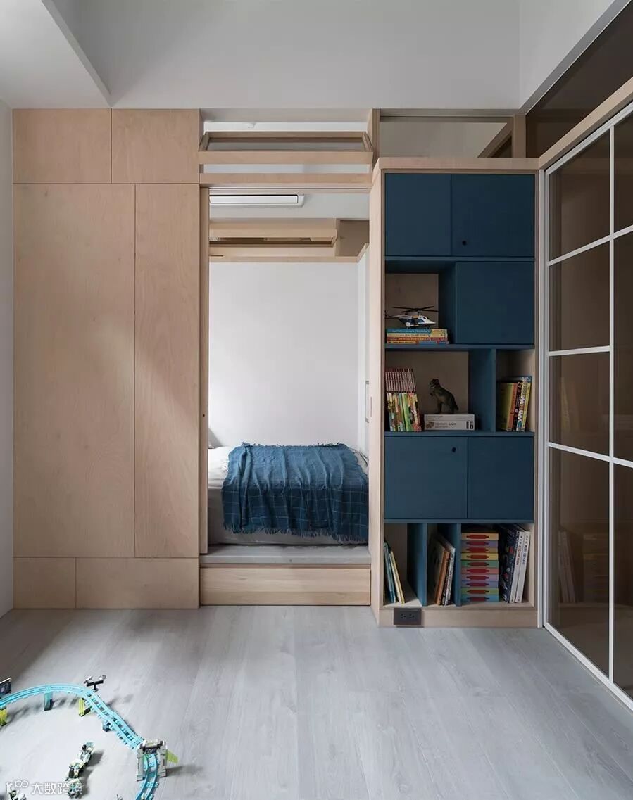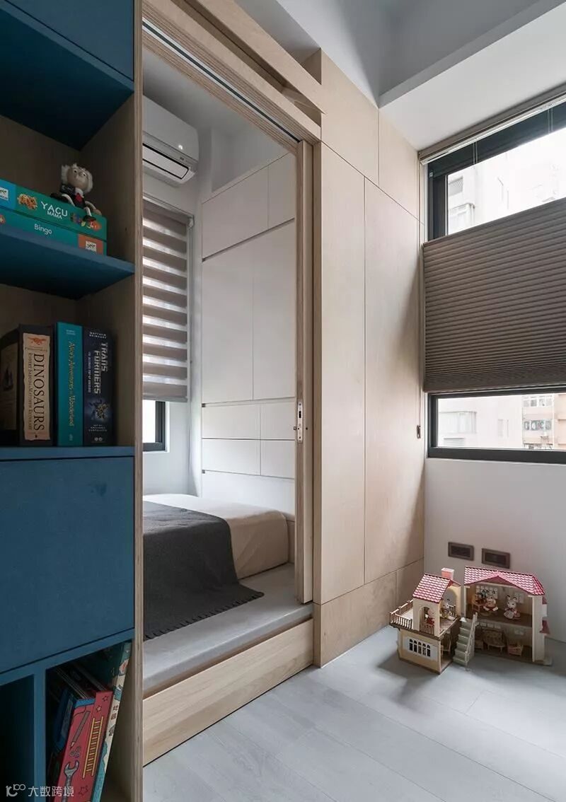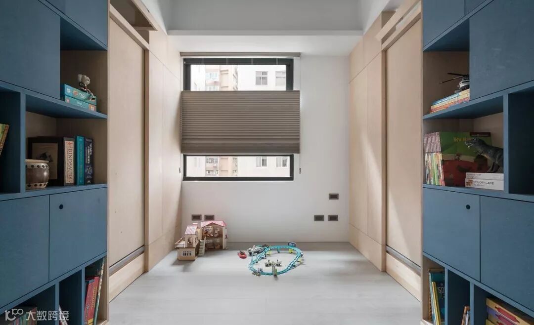 在经过格局调配后,原本一大一小的小孩房,调整为2间小卧房,中间则采以游戏室作过度,并配置不少收纳书柜,让此区充满弹性,未来也可作为孩子的公用书房,一举两得!