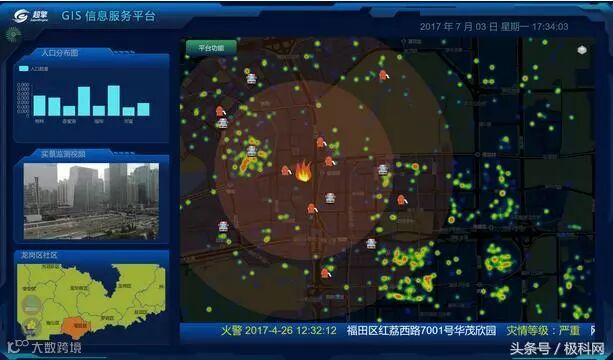 三 、城市应急救灾----实时火警监测。包括灾害等级评估,受影响范围及建筑物数量评估等,并实时传输高清灾情画面。