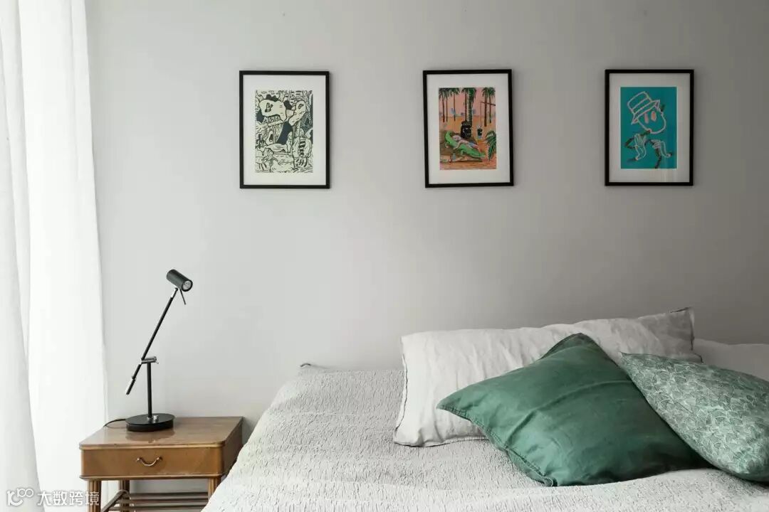 小色块挂画+灰白色的床品+绿色靠垫,如沐春风般舒服