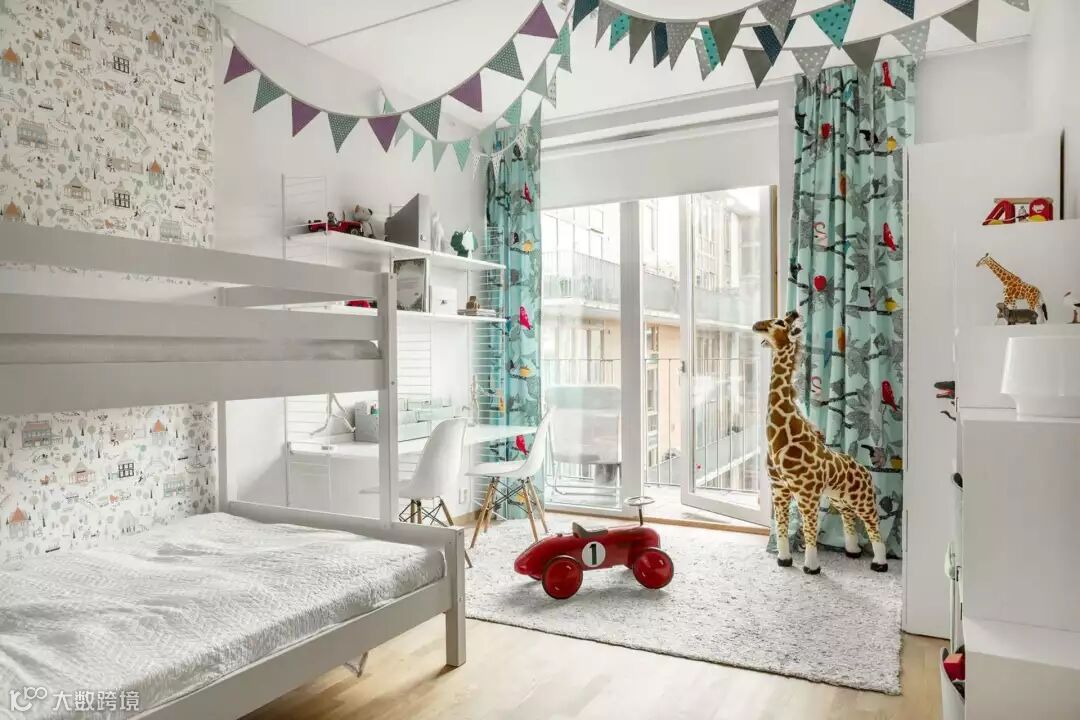 儿童房,壁纸和宜家(Ikea)的窗帘布,增添了不少童趣