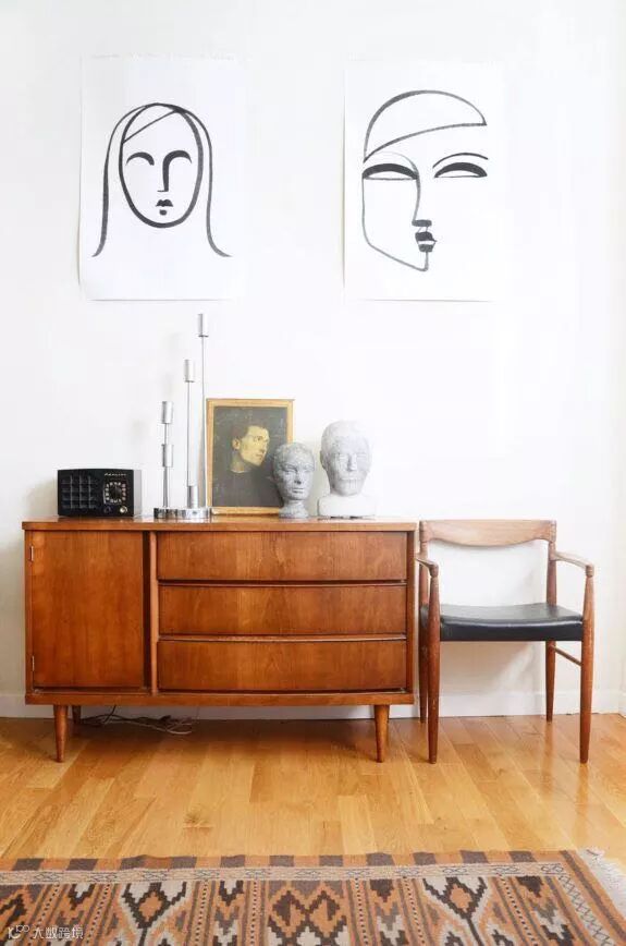 选挂画说起来容易,其实很难。选古典的,还是现代的?浓墨重彩的,还是线条画。这间公寓在客厅、小卧室(书房)还有主卧都挂了画。为了配合整体克制的色彩,客厅区域用了白色线条画,卧室配了小幅色块画。