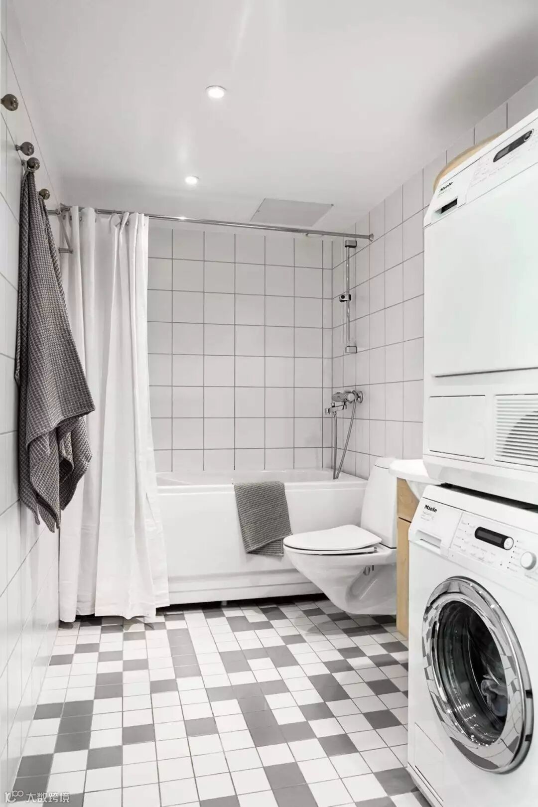 这间公寓的卫生间铺砖,也有可圈可点之处。墙面的砖用20×20mm的白色方砖,地砖用10×10mm。但地砖是灰色和白色搭,而且是无规则混搭,最终效果很动人。