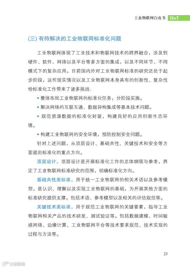 工业物联网体现了工业技术和物联网技术的跨界融合,涉及到硬件、软件、网络以及平台等多方面的集成,以及不同环节、不同模式下的复杂应用。标准化工作面临着不少挑战,需要从顶层设计、基础共性、关键技术和安全等方面提出标准化的重点方向。