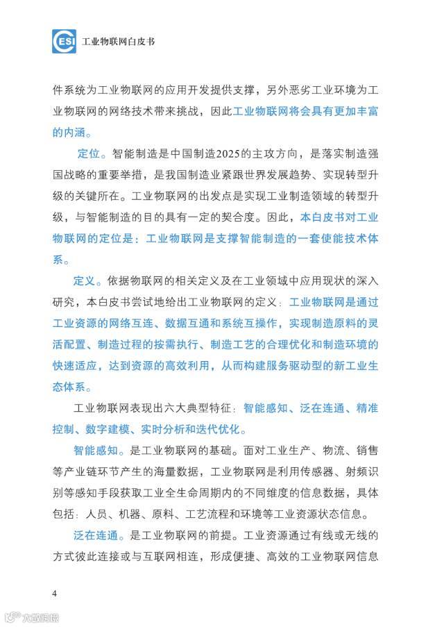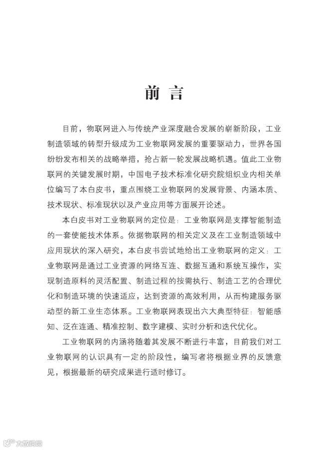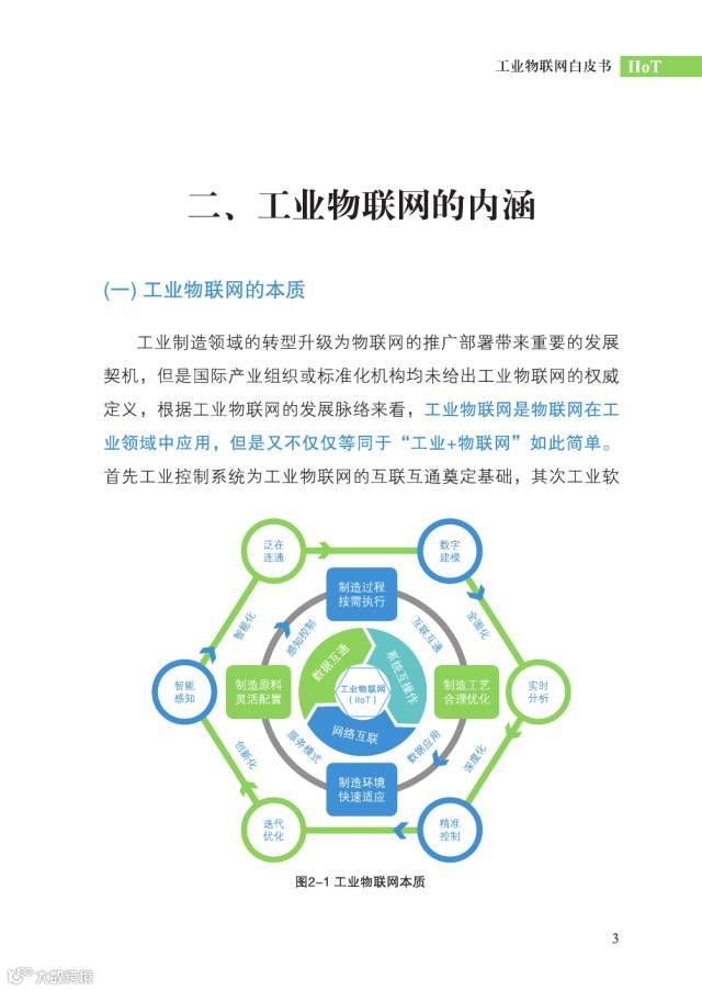 白皮书就工业物联网的背景、内涵、技术现状、产业现状、标准现状和应用几个方面进行了阐释。白皮书特别指出,工业制造领域的转型升级为物联网的推广部署带来重要发展契机,工业物联网是物联网在工业领域中应用,但不仅仅等同于“工业+物联网”。白皮书进一步对工业物联网进行了定位:工业物联网是支撑智能制造的一套使能技术体系。