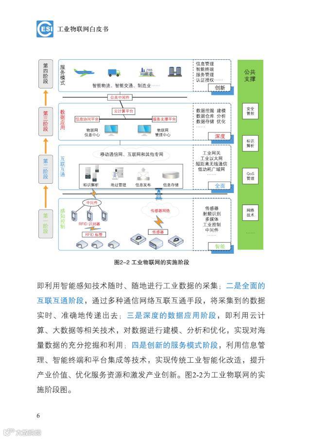 白皮书将工业物联网实施的四个阶段,智能的感知控制、全面的互联互通阶段、深度的数据应用阶段、创新的服务模式阶段。全方位构建工业物联网创新的服务模式生态圈,提升产业价值,优化服务资源。