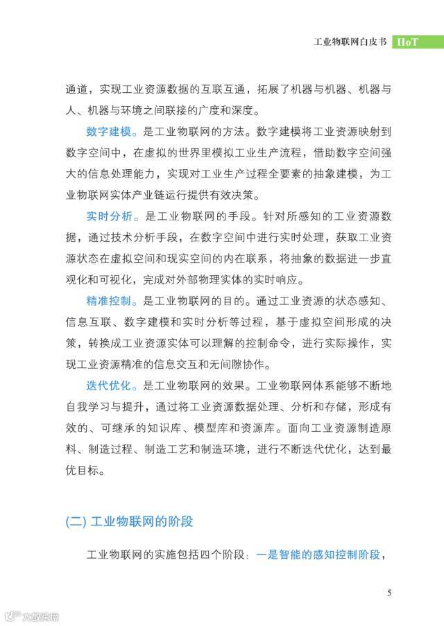 工业物联网是通过工业资源的网络互联、数据互通和系统互操作,实现制造原料的灵活配置、制造过程的按需执行、制造工艺的合理优化和制造环境的快速适应,达到资源的高效利用,从而构建服务驱动型的新工业体系。工业物联网表现出六大典型特征:智能感知、泛在连通、精准控制、数字建模、实时分析和迭代优化。