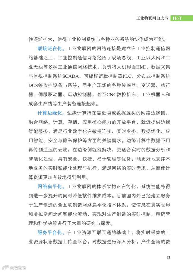 未来工业物联网的技术趋势,将呈现终端智能化、联接泛在化、计算边缘化、网络扁平化、服务平台化五个方面。终端智能化,体现在两个方面,一是底层传感器设备自身向着微型化和智能化的方向发展,另一方面是工业控制系统的开放性逐渐扩大,使得工业控制系统与各种业务系统的协作成为可能;联接泛在化,扩大化的网络联接;计算边缘化,边缘计算指在靠近物或数据源头的网络边缘侧,融合网络通信、存储、计算、应用核心能力的开放平台,就近提供边缘智能服务,满足行业数字化在敏捷连接、实时业务、数据优化、应用智能、安全与隐私保护等方面的关键需求;网络扁平化,IIoT的体系架构正在简化,系统性能将得到进一步提升的同时降低软件维护成本;服务平台化,基于平台的开放能力,根据用户实际需求提供设备远程管理、预防性维护和故障诊断等服务。