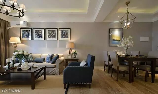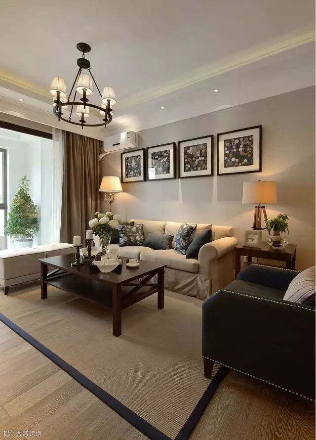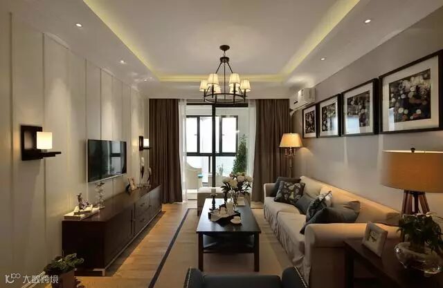 客厅以简化的美式线条,整体通过咖色色调,结合暖色灯光显得格外温馨优雅;