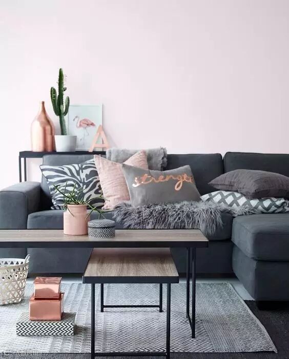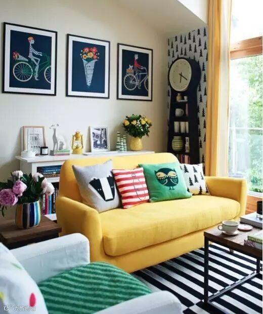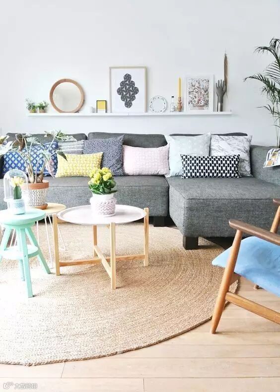 糖果色抱枕、茶几+明亮花卉大叶绿植+多个趣味摆件=明快活力的风格