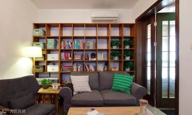 即使是小小正方形客厅也能容纳一整面书架。