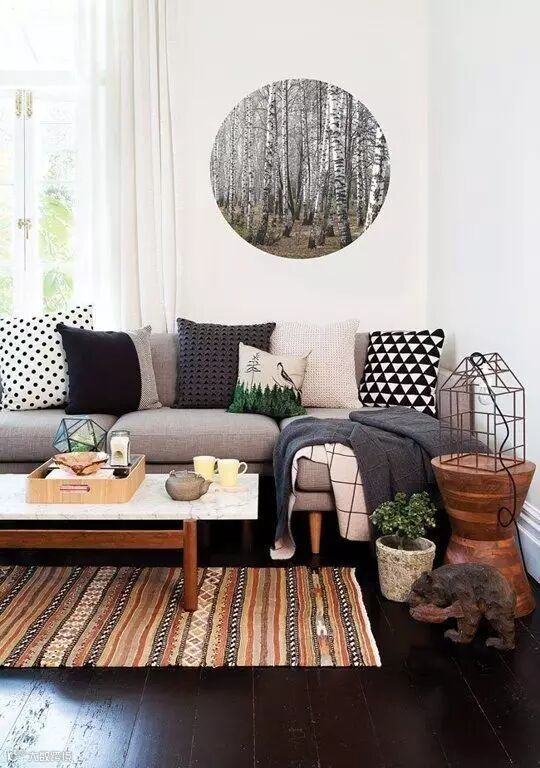深色抱枕+小盆绿植+深木色茶几边桌+素色挂画=禅意沉稳的风格