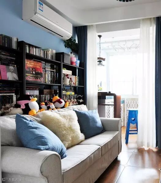 沙发做收纳遮挡,把焦点集中在柜面摆设。