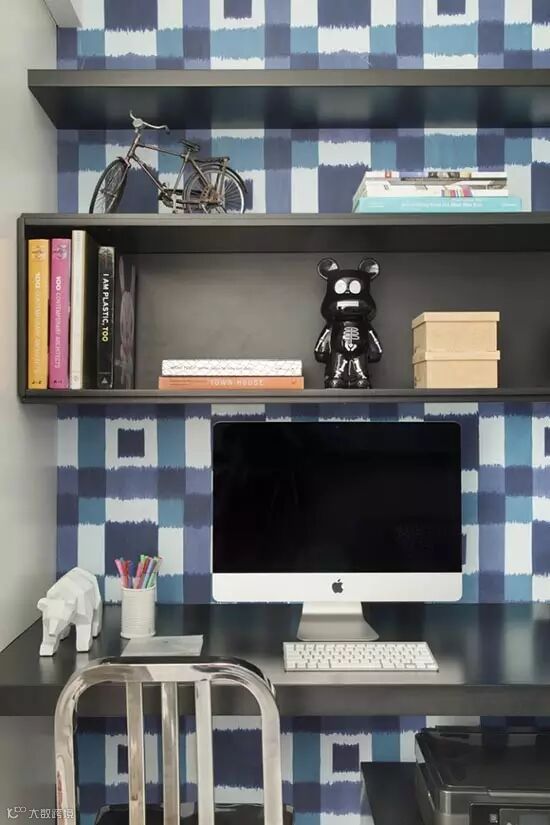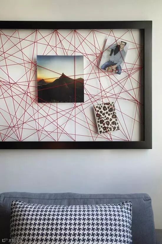 书房空间虽然面积不大,但是布局紧凑却不显拥挤。开放式和闭合式的柜体设计,让空间层次更加丰富。沙发墙上用红线交织出艺术感,中间再搁置几张照片,吸睛十足。