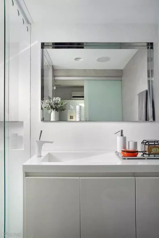 主卧的卫浴间采用不透明材质的玻璃推拉门,在营造轻盈感的同时也尊重了隐私。卫浴间的盥洗台面采用了不常见的斜面设计,一想到房主人的艺术家身份,也就了然了~