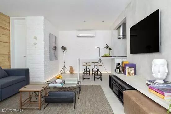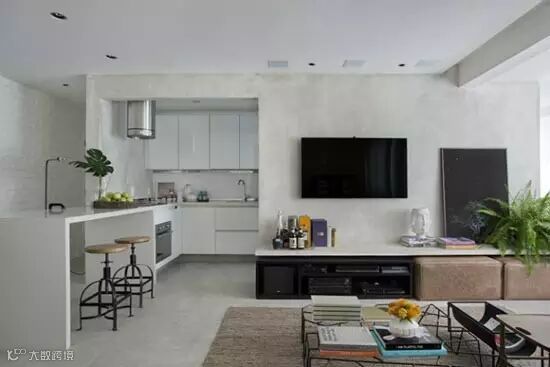 公共区域采用白色的主色调,不仅让空间更显简洁,也迎合了屋主的个人喜好;吊顶处均匀分布的筒灯设计,让光源更加均匀。原木色沙发背景墙在增添空间变化的同时又不显违和。