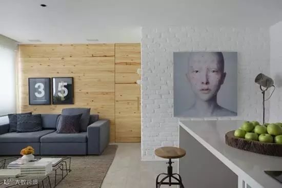 步入玄关后,一幅大型人物艺术画像随即映入眼帘,在白色文化石的墙面衬托下,艺术感油然而生。墙面的底部还特地设计了光源,晚上走进家时就像在T台上走秀一般,时尚感爆棚啊!