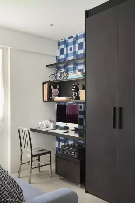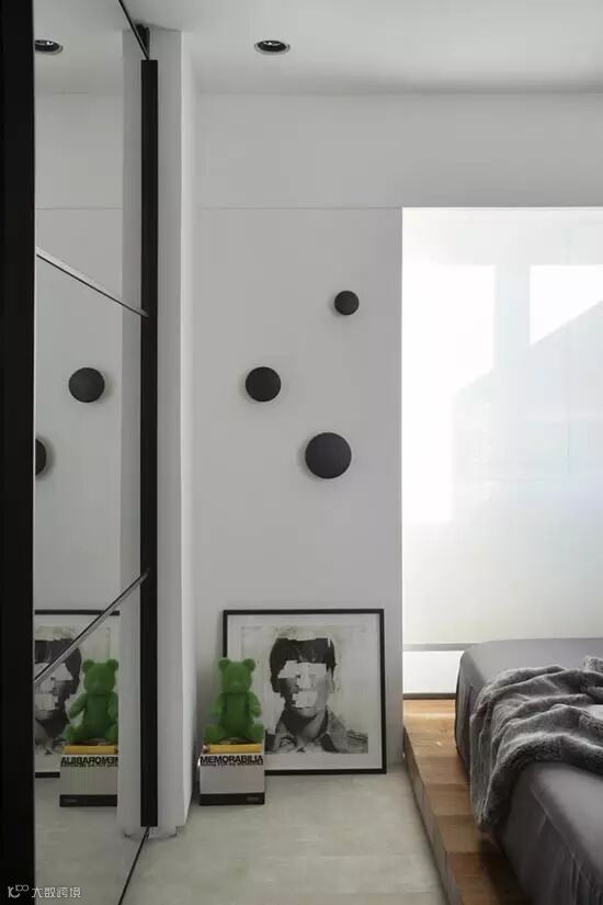 卧室用架高的木板来区隔卧眠区域。在床头的墙面部分采用了黑色,和大面积的白色形成鲜明对比。深色系的床品给空间增添沉稳质感,明黄色的复古壁灯彰显不俗品味.用黑色的玻璃镜面做衣柜面板,让小卧室能延伸出大视觉。