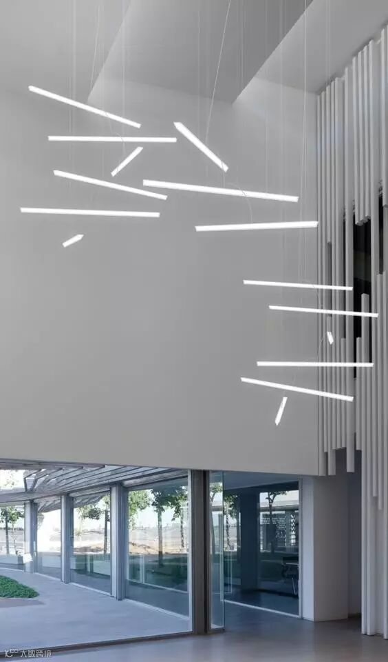 简单的同一造型的灯管,通过排列,在高层高的空间里,不仅实现了整个大空间柔和的照明,顺便还使空间更有层次感。