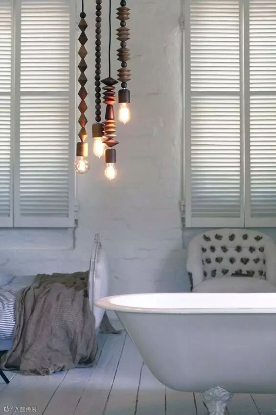 浴室里如果有这样的灯,虽然简简单单的灯泡、暖光、土质串珠元素,就是这样的简简单单,却让整个空间从单调素寂中拜托出来,不信你用手遮掉灯感受下原来空间的味道。