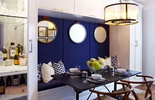 蓝色,是一种令人产生遐想的色彩。传统的蓝色常常成为现代装饰设计中热带风情的体现。蓝色还具有调节神经、镇静安神的作用。蓝色清新淡雅,与各种水果相配也很养眼,但不宜用在餐厅或是厨房,蓝色的餐桌或餐垫上的食物,总是不如暖色环境看着有食欲;同时不要在餐厅内装白炽灯或蓝色的情调灯,科学实验证明,蓝色灯光会让食物看起来不诱人。但作为卫浴间的装饰却能强化神秘感与隐私感。