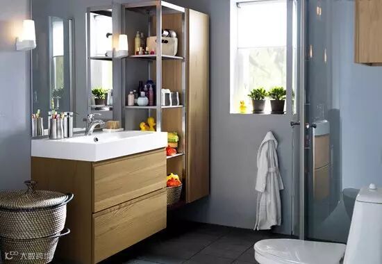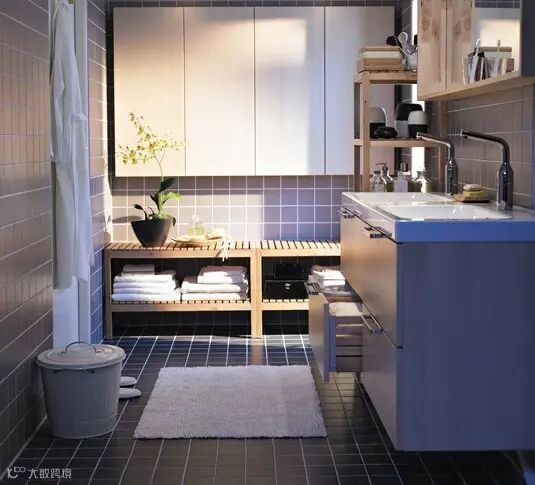 带有悬空柜架的浴室柜设计地非常灵活,看得出设计师专门考察和研究过人们的生活习惯,陈列式和封闭式结合,将常用的和不常用的分开摆放,取用非常方便。在只有四五平方米左右的小卫浴间中,淋浴器、马桶、洗脸台已经占据了不少面积,所以要做到干湿分离并不容易。高高的浴室柜充分利用了上层空间,加大了收纳量,即使放在狭小的浴室内也不会拥挤。