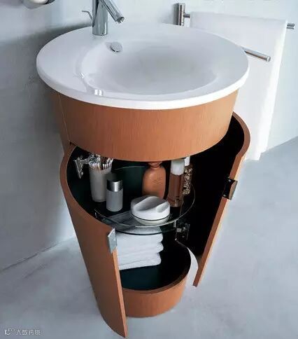 圆柱形设计巧妙地将收纳柜与洗面盆结合成一体,不但节省了空间,也为浴室带来一点新颖的创意。圆柱形的柜体可轻松安置在浴室的每一处角落,无棱角的外形也避免了使用中的磕碰摩擦。值得一提的是柜门的设计,不仅取拿方便,而且趣味十足。