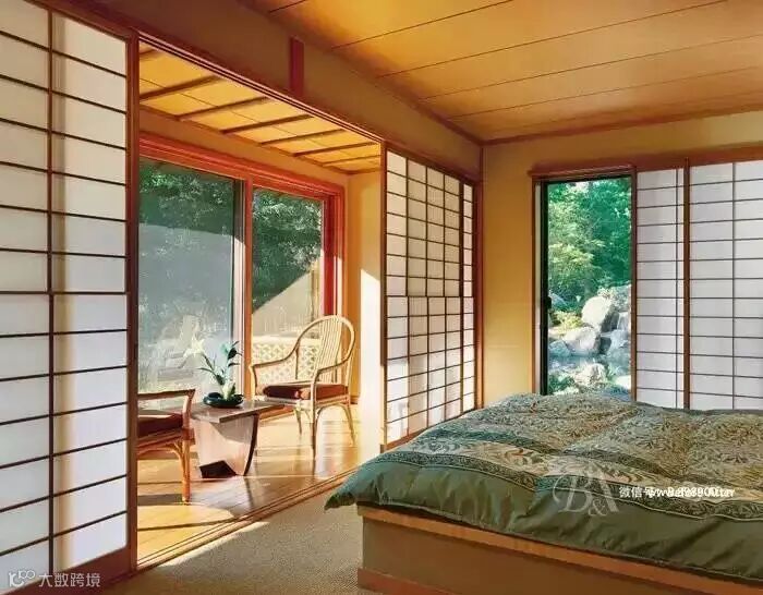 传统日式居室以天然木材家具为主,而席地而坐或卧的榻榻米则是其最大特色。半透明的推拉式木格子门也是日式重要元素之一,在光与影的变化下,有一种淡雅的朦胧美,营造出空灵流动的禅意氛围。