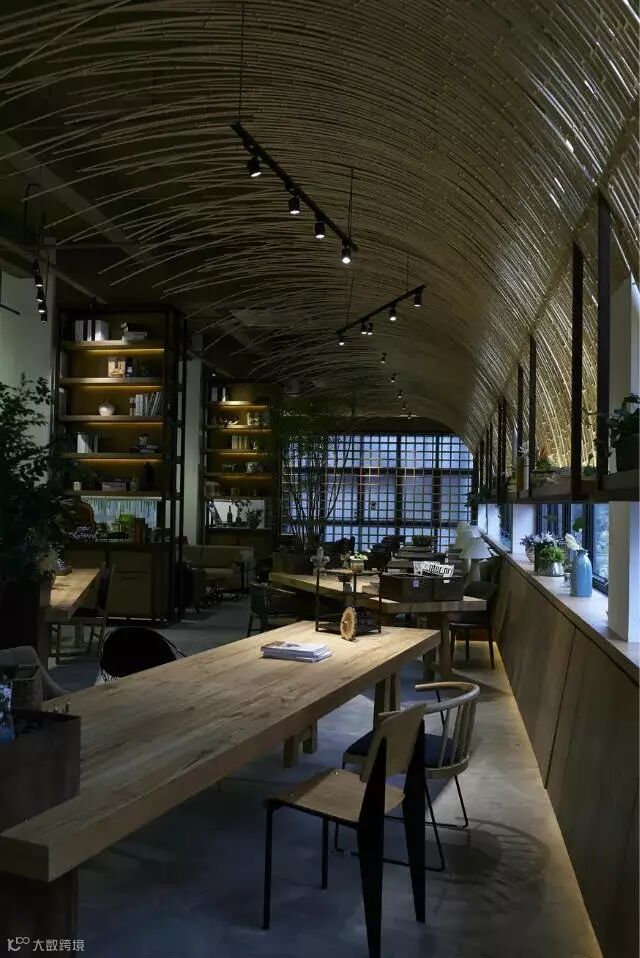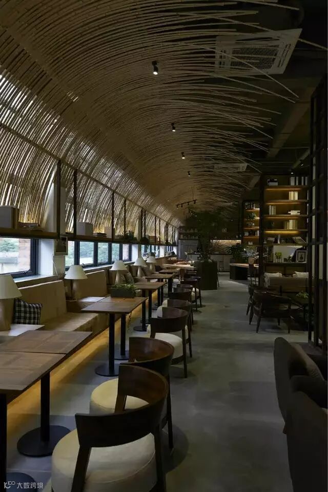 选择竹片,源自于壹壹 “健康、自然、本质”的出发点,提供的咖啡豆、水果、食物均采用健康、新鲜的食材,而与它匹配的空间材料,则是原生态的竹片。在这个长条形的空间里,创意性的靠窗栏面制作了半环绕的整面竹片,或长或短,不求定势的自由弯曲,显示了它的自然和韧性。原始的毛石、腐锈的钢板,恰恰也展示了朴素的质感、本真。