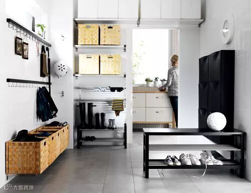 临出门时必定经过的门厅是放置鞋子、包包、配件等物品的地方,也可在换季时将这些物品收纳在此,只需在墙壁的空白处或者门上方打造几个搁板,利用合适尺寸的收纳盒,就能在这里完成门厅的换季。
