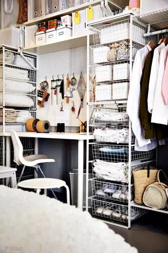 对于空间比较狭小的居室来说,任何一个能够利用的地点也不应放过。比如办公桌两旁、上方都能够利用起来。简单的置物架配合置物篮,包括换季的枕头、毯子等等衣物都能够整齐码放起来。