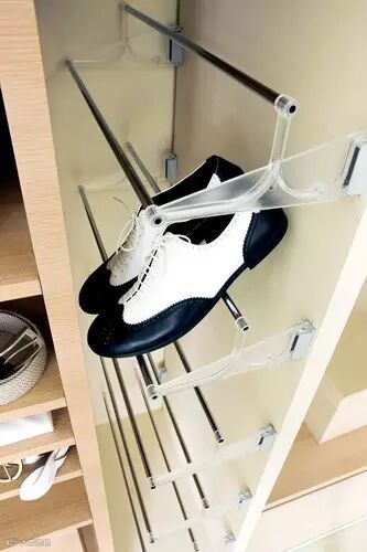 鞋子的收纳让不少人头疼不已,经常穿的鞋子可以放在门口的鞋柜上,而换季下来或者不经常穿到的鞋子就不知该如何处理。其实只需在衣柜中,或者靠墙的夹缝中增添几排金属架,就能够很好地完成鞋子的收纳。