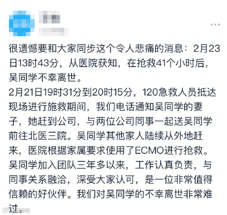 2月23日,针对网传字节跳动吴姓员工猝死一事,字节跳动内网发布公告称,经过41小时的抢救后,该员工于13时43分不幸离世。