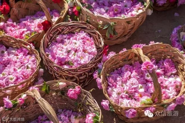 这里的玫瑰据说全年仅有80小时的采摘时刻。清晨,穿着鲜艳民族服装的大人、孩子们,载歌载舞的来到园中,提花篮分散在一行行花丛中,一边兴高采烈地采花,一边放声高唱。采摘玫瑰活动从凌晨5点开始,这时的玫瑰花瓣上含着晨露,有着最新鲜香气和最纯粹含油量。